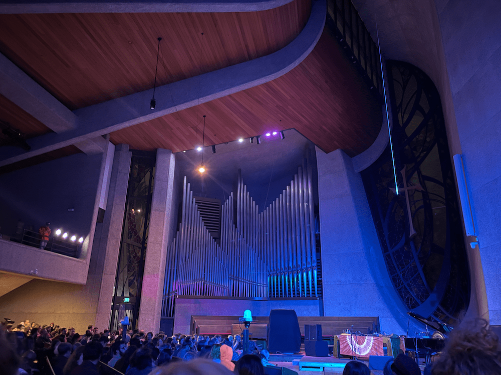The space felt more vast on the inside than it looked from the street, and the spiraling void of the ceiling was awe-inspiring. I took a seat to the right of the altar, or where I assume another table had been set up and prepped with machines and cables and a set of unique percussion instruments. There was an organ built into the wall across from where I sat, left of center, which overlapped itself to make an undulating landscape out of the smooth, gleaming pipes. I knew it wouldn’t be used tonight, but just the presence of the organ made me begin to feel the weight of the night.
